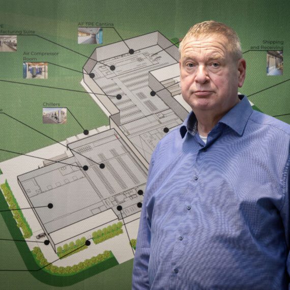 Ben Bode bij een plattegrond van de productielocatie in Coevorden. In het voorjaar van 2022 opende het Amerikaanse bedrijf NewAge...