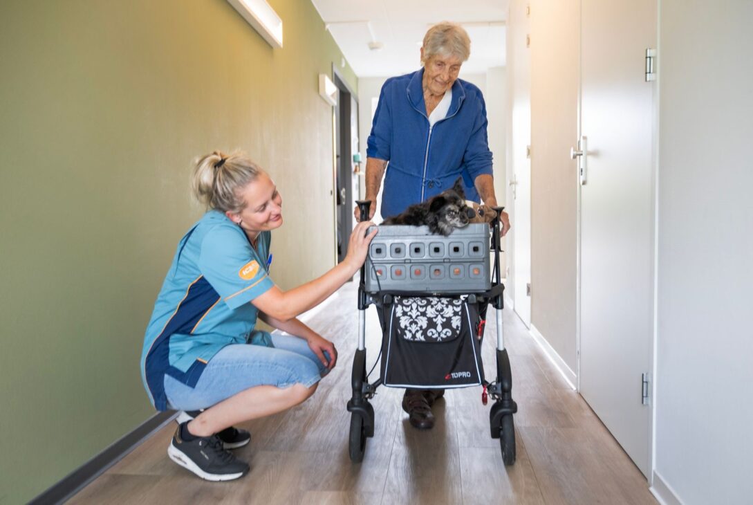 Hoe dit er in de praktijk uitziet, vertelt Esmé Alink, specialistisch verpleegkundige in kleinschalige woonzorglocatie Altingerhof te Beilen: „Voordat iemand bij ons komt wonen, gaan we bij deze persoon thuis op bezoek om kennis te maken. We bespreken wat iemand graag doet in het dagelijks leven of wat belangrijke mensen voor diegene zijn. We zoeken daarbij ook de verbinding met de familie. Zo kwam er een mevrouw bij ons wonen en tijdens de kennismaking gaf zij aan: ‘Ik kom niet als mijn hondje Binky niet mee mag.’ Dus toen hebben we samen met de familie, met mevrouw zelf en met de medewerkers van de woning gekeken hoe we dit mogelijk konden maken. En dat lukte door het maken van duidelijke afspraken. Mevrouw laat Binky zoveel mogelijk zelf uit, haar dochter is altijd bereikbaar als het nodig is en ondersteunt haar daarbij. Als het mevrouw een keer niet lukt, dan springen de medewerkers bij. Als je goed in verbinding bent met elkaar, dan is er vaak meer mogelijk dan je in eerste instantie denkt.”