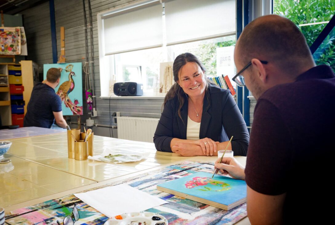 De begeleiding van onze cliënten, ziet Monique Menger, is in de loop der jaren steeds complexer en intensiever geworden. „Dat maakt het ook zo essentieel om samen te werken. Veel van onze cliënten hebben te maken met een veelvoud van problemen en zijn langdurig afhankelijk van professionele ondersteuning. Maar altijd geldt: stapjes leren zetten, hoe klein ook en daarmee ook tevreden kunnen zijn. Het is de kunst de juiste toon aan te slaan, maar ook dat moet je leren. Wat werkt bij wie, hoe kun je wel door weerstand heen breken? De kern zit in de vraag ‘Wat wil jij en hoe kunnen we jou daarbij helpen’? Hoe complexer die vraag feitelijk is, hoe essentiëler de samenwerking, met GGZ, de naasten, maar ook het sociaal domein van Friesland en de vrijwilligersorganisaties en daar kunnen we met elkaar nog een hele slag in slaan. Want in dat proces van behandelen en begeleiden, gaat het om leren omgaan met je eigen kwetsbaarheden, hoe je dit kunt leren hanteren in onze maatschappij en hoe de maatschappij daarbij kan helpen. Leren geloven dat ook jij dat kan, ook al duurt het misschien wat langer. Altijd uitgaan van dat wat iemand wel kan.”